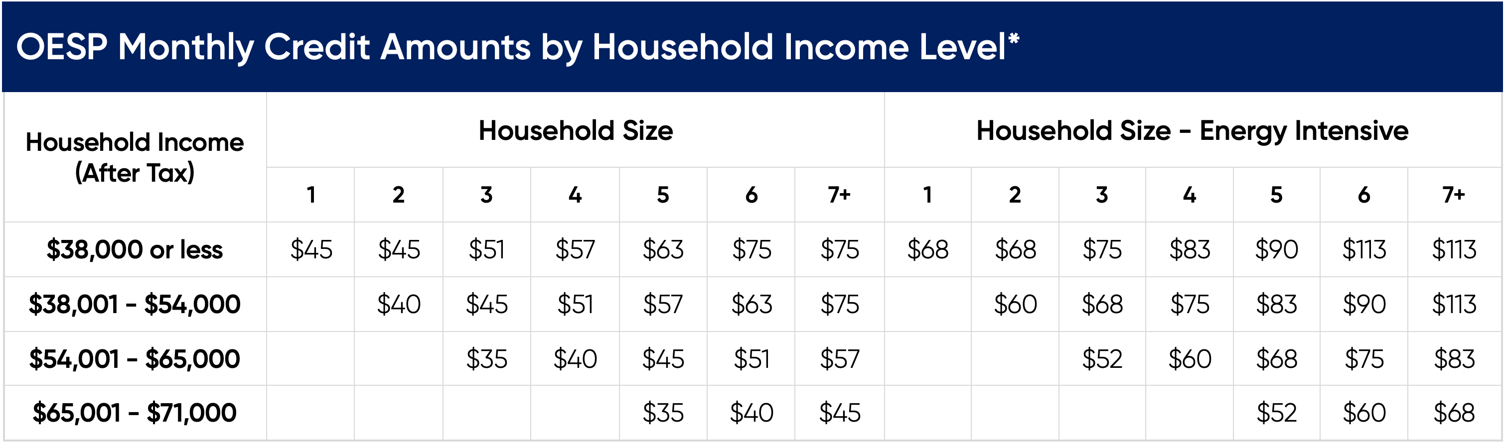 The Ontario Electricity Support Program (OESP) offers eligible low-income customers a fixed monthly credit on their electricity bills. The credit amount varies based on household size and total after-tax income.